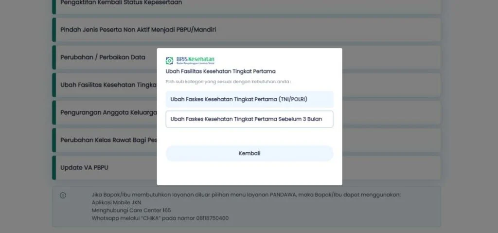 - Pilih Jenis Perubahan Faskes: CHIKA akan memberikan beberapa opsi perubahan data, pilih opsi yang berkaitan dengan "Perubahan Faskes". Kita harus memastikan pilihan ini benar.