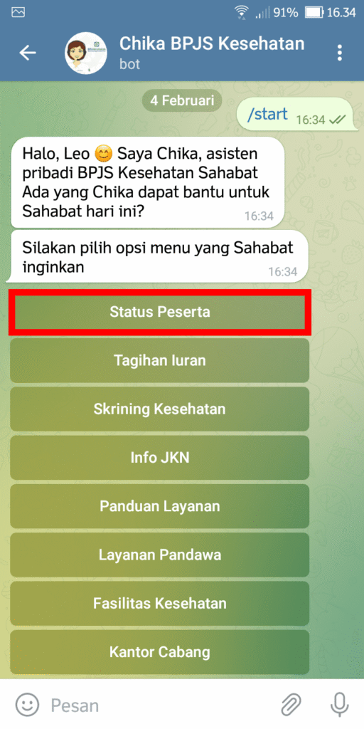 - Chika (Chat Assistant JKN) via WhatsApp: Mirip dengan Telegram, Chika juga menyediakan layanan otomatis untuk pertanyaan umum dan cek status.
